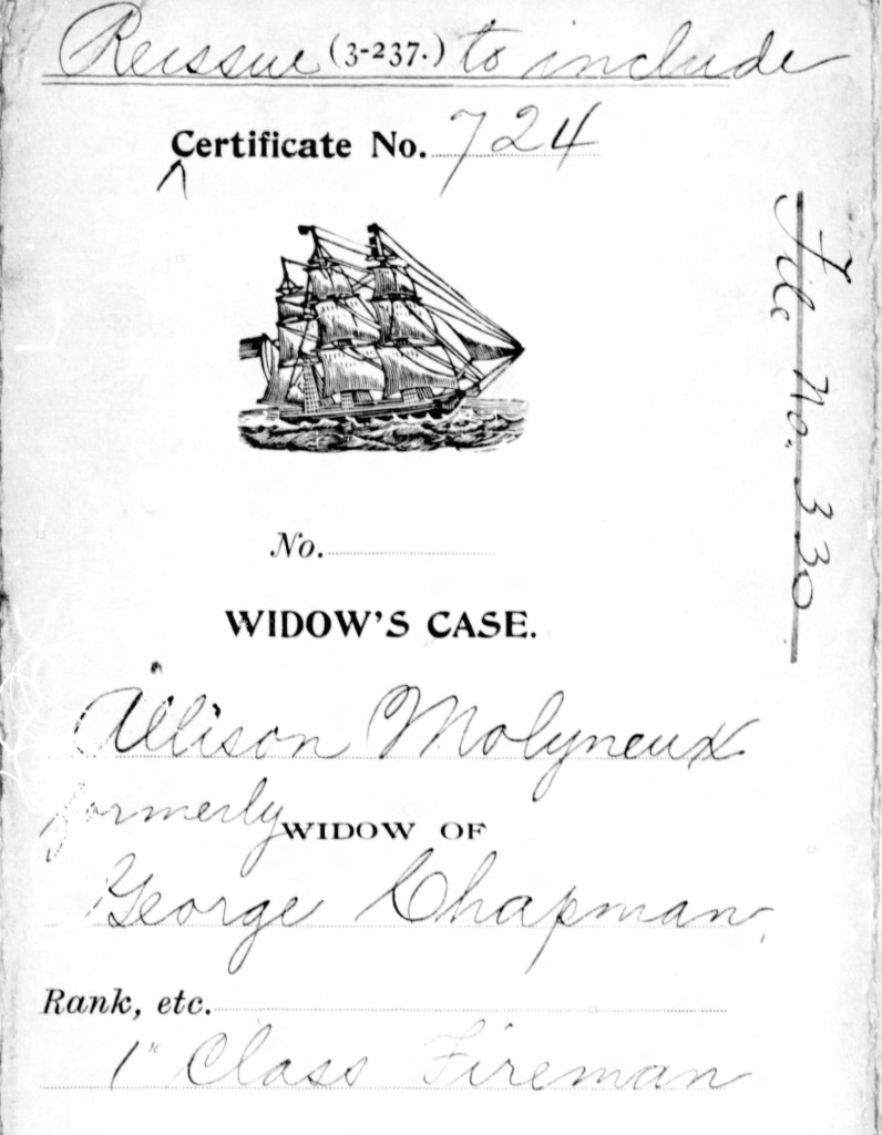 George’s machinist skills likely led to his 1st Class Fireman Rating. He certainly bore the physical marks of a hard working-class life. His age also increased the likelihood that he was married- and so it proved. His wife’s widow’s pension reveals still more about his life.
