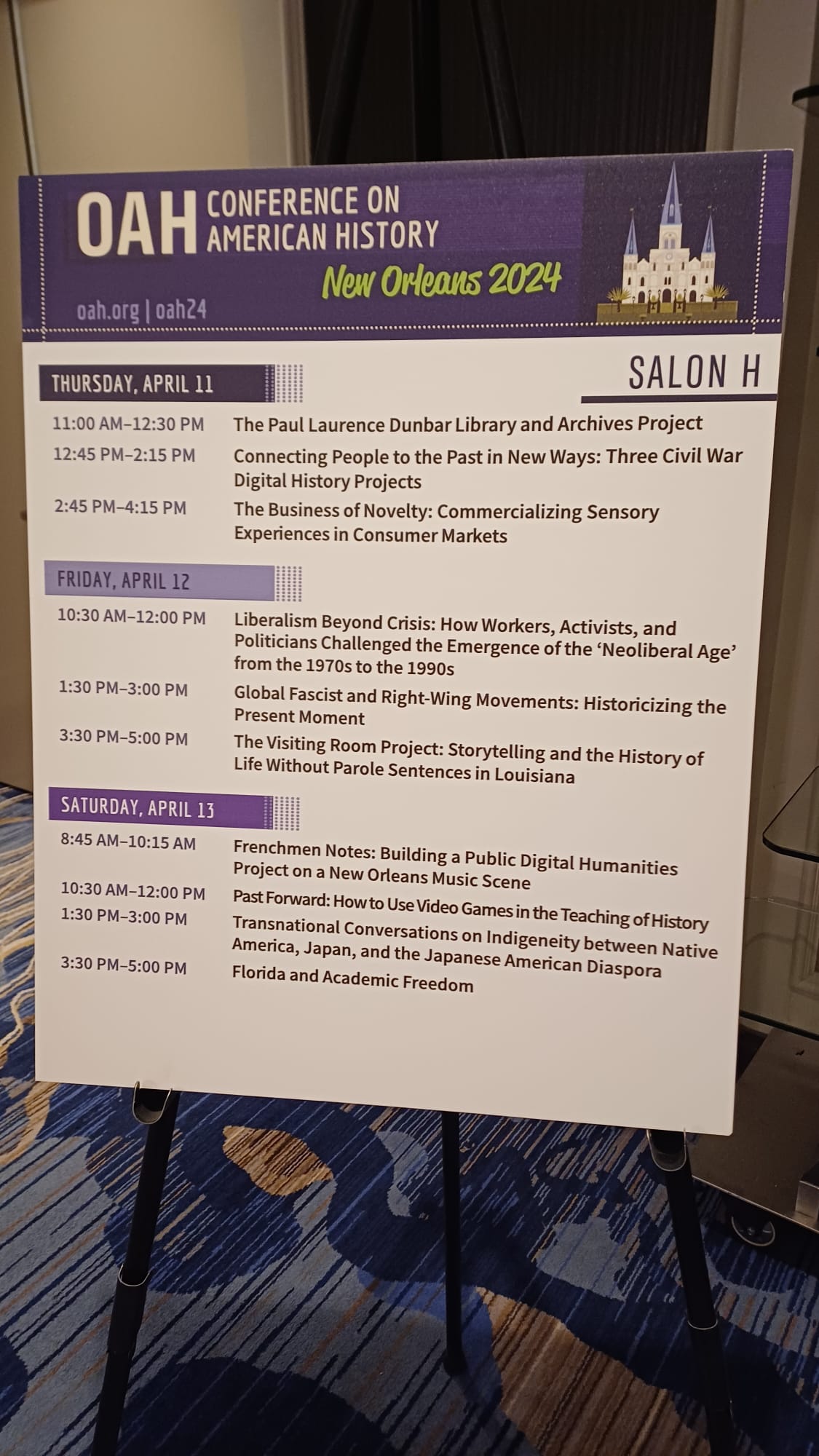 Our final stop was at New Orleans for the 2024 Organization of American Historians Conference. On the 11th April we were part of a panel entitled Connecting People to the Past in New Ways: Three Civil War Digital History Projects. Our paper was Civil War Bluejackets: Telling the Macro and Micro Stories of the Common Sailor through Big Data. We were fortunate in the session to have an opportunity to engage with and consider the work of a number of notable digital projects. We shared the panel with Dr Susannah Ural and Dr Lindsey Peterson, who drew on their work on The Civil War & Reconstruction Governors of Mississippi Project to discuss free digital archives and reaching marginalized audiences, and with Dr Paul Quigley and Dr KT Shively of the Experiencing Civil War History through Augmented Reality Project, who explored the opportunities and challenges of their work at Pamplin Historical Park in Virginia. Insightful and thought-provoking comments were provided by Dr Anne Sarah Rubin and Dr Hilary Green.
