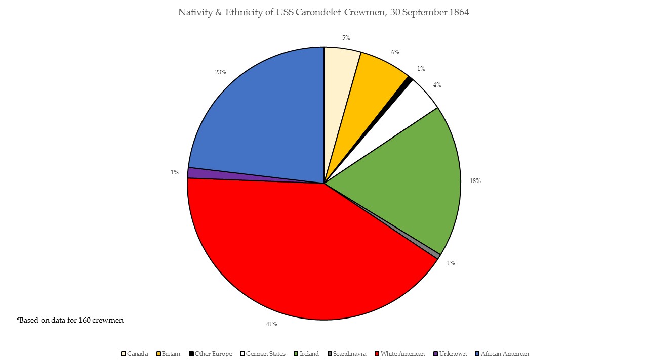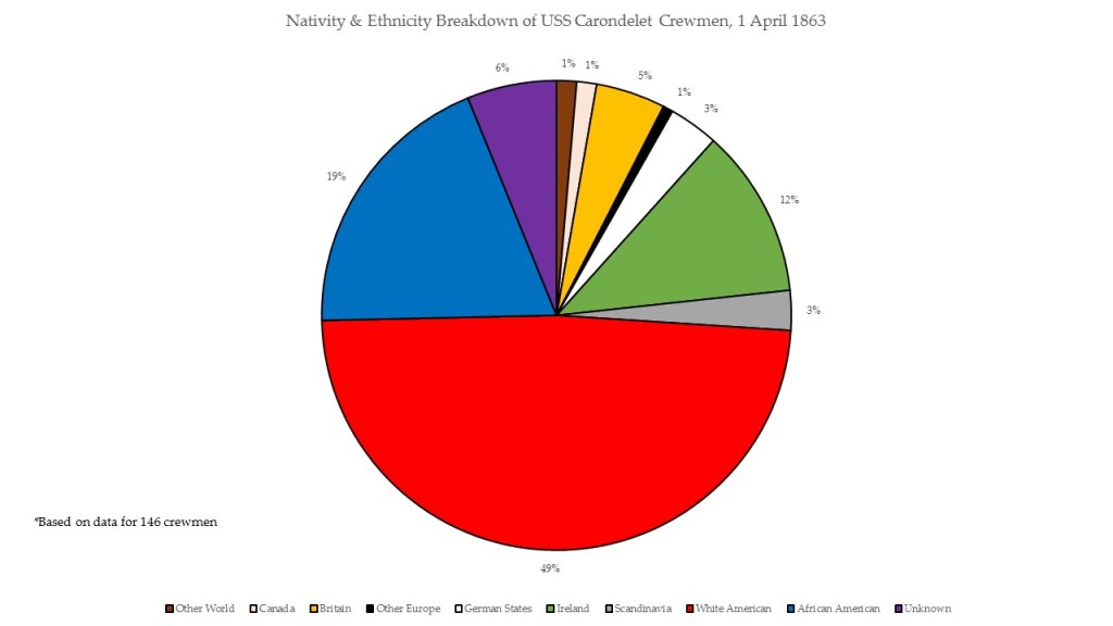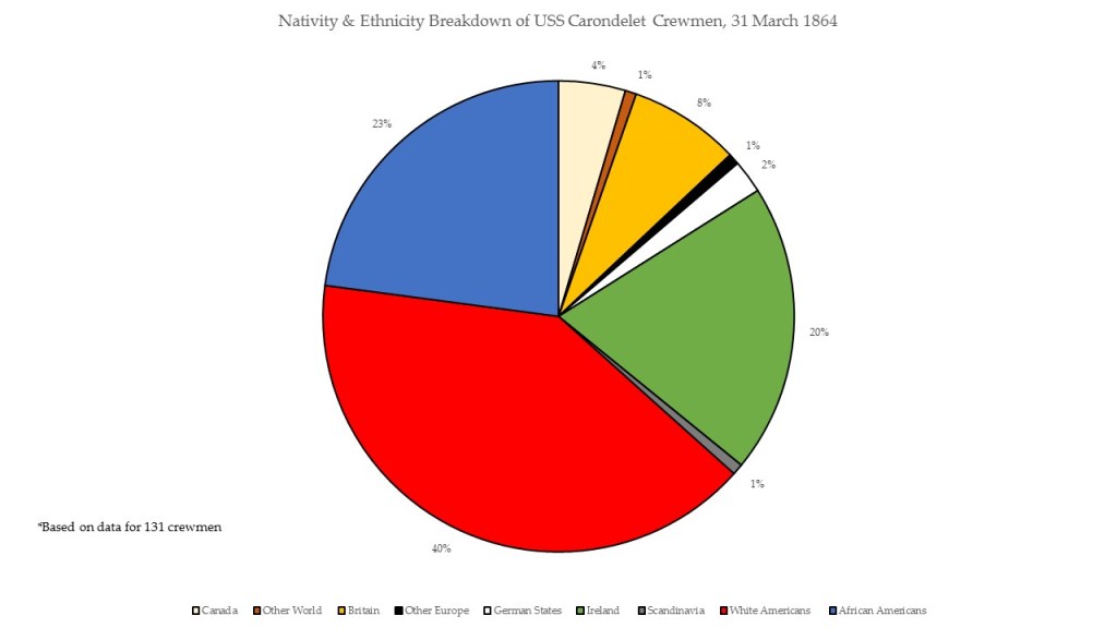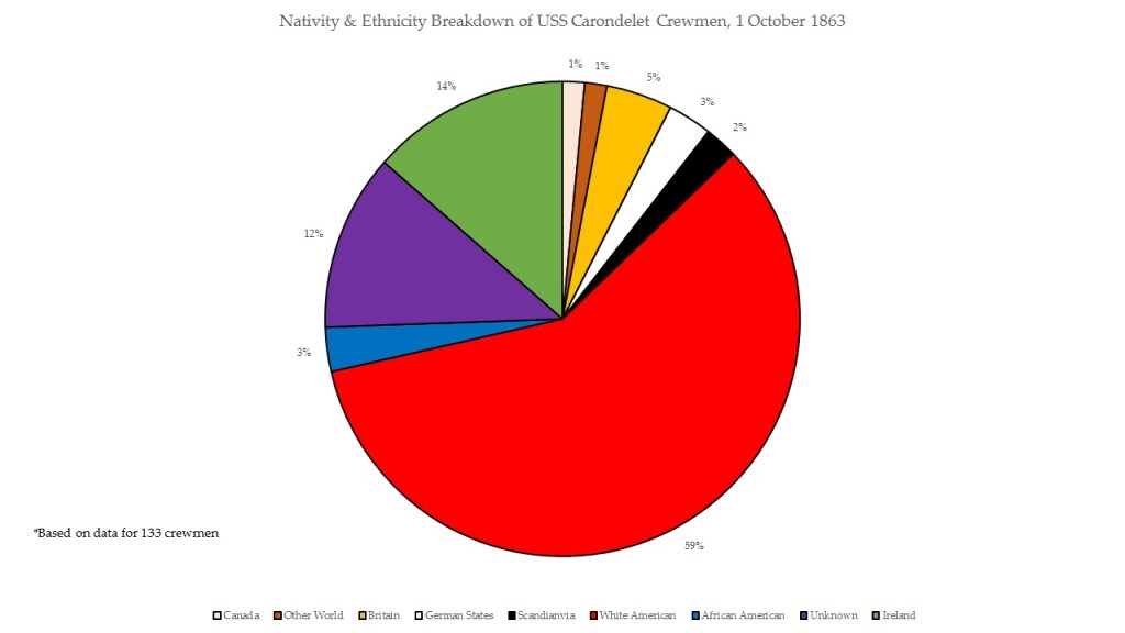 Visualisations of the nativity and ethnicity data taken from the surviving muster rolls of USS Carondelet between 1863 and 1865. Click on each image to enlarge. The initial chart follows the change over time; this indicates that while native-born white Americans made up almost 50% of the crew in early 1863, this figure fell as the year progressed and rarely exceed 40% after that date. Following the Emancipation Proclamation, the African American representation climbed from 20% at the beginning of 1863 to a high of almost 30% by mid-1864, before falling precipitously from late 1864 through to the end of the conflict. Men of Irish and British nativity made up only an extremely small proportion of the Carondelet‘s crew at the start of 1863, but by the Spring of 1864 they made up almost 30%. Their percentage representation was at its peak just prior to the war’s conclusion in 1865, when they made up over 30% of the sailors. These changing demographics likely impacted the nature and form of shipboard dynamics through the course of the war. Beneath the overview graphic are the individual breakdown visualisations for each muster, which you can click on to enlarge.